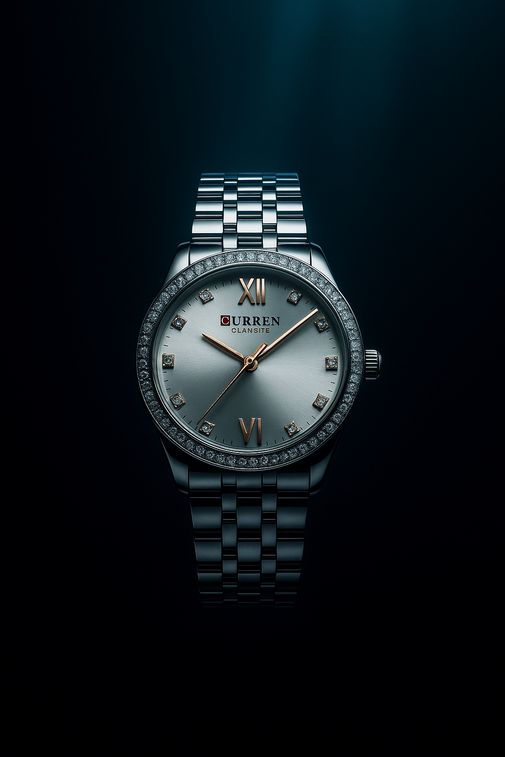 Diseñado con una precisión que honra el tiempo, este reloj combina la elegancia clásica con la sofisticación de los detalles contemporáneos. Su esfera satinada está realzada por marcadores con acentos brillantes y números romanos en relieve, enmarcados por un bisel de acabado diamantado que captura la luz en cada ángulo.
