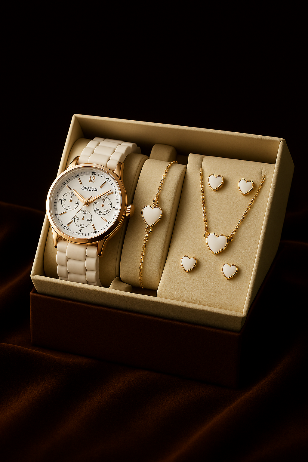 • Romantic Luxury Design: This elegant set features a beautifully coordinated wristwatch, bracelet, necklace, and earrings — all accented with white enamel heart charms. A timeless symbol of love with a modern luxury twist.